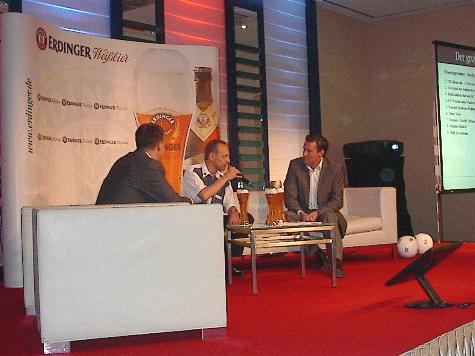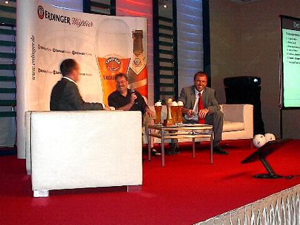 Oliver Welke war so freundlich, den “Wackelkontakt” in meinen Krücken beim Gang auf die Bühne abzusichern, der Pokalübergabe durch Pit Gottschalk folgte die Talkrunde, in der ich vieles erklären und ansprechen konnte. Ein großer Dank an ERDINGER im Namen aller Monatssieger war mir möglich und das Thema Schiedsrichter, Akzeptanz und Medien wurden ebenfalls behandelt. |