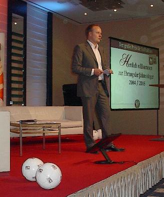 In einem Rahmen wie bei einer Oskar-Verleihung wurde in allen Kategorien und für einen erneut vergebenen Sonderpreis jeweils eine eigene Laudatio gehalten, in der nochmal alle “nominierten” Monatsgewinner genannt wurden, bevor mit einem “and the Winner is...” die Katze aus dem Sack gelassen und die jeweiligen JAHRESSIEGER genannt wurden. Mein persönlicher klarer Favorit in der uns betreffenden Kategorie war der oben schon erwähnte Willi Krautheim, dem ich aufgrund seines Alters, seines bewegten Fussball-Lebens und seiner netten und herzlichen Art diese Auszeichnung von Herzen gewünscht habe. MICHAEL HINKEL ! Man sagt, ich sei selten sprachlos, in diesem Moment verlor ich fast die Fassung! Die Laudatio von Pit Gottschalk drang nur durch einen Tunnel zu mir, in der die Entscheidungsgründe der auf mich getroffenen Wahl genannt wurden. Der gemeinschaftsfördernde Sinn der hobbyteams.de, die Bemühungen zum besseren Umgang untereinander insbesondere durch den Fairness-Award und auch das Engagement für mein Team “Fussball-Moorhühner” wurden da herausgestelt. Die ersten schon während der Laudatio erhaltenen Glückwünsche des ERDINGER-Teams konnte ich gar nicht wahrnehmen, erst als ich auf die Bühne gerufen wurde, war mir klar: hier stimmt was nicht..... |